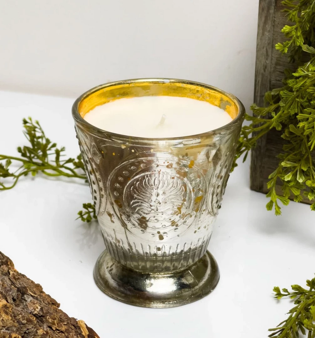 Dainty silvered glass, with an embossed fleur de lys on a pedestal base offered in several colors.