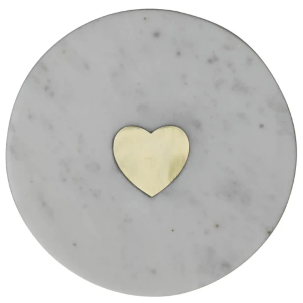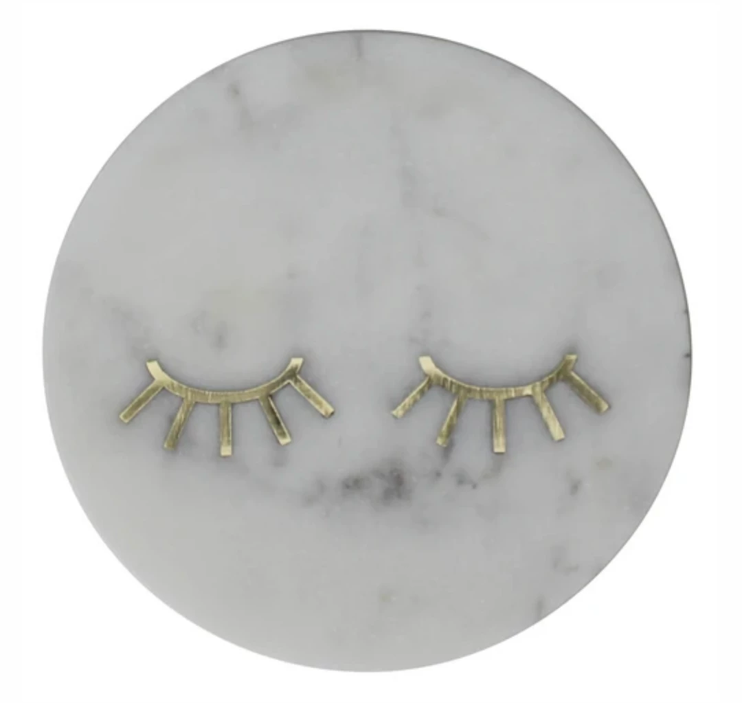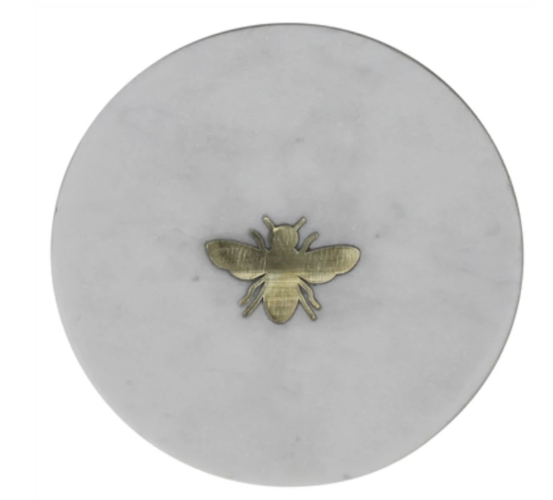 Thick white marble is honed with a soft indentation and inset edge then dressed up with happy-making and smile-inducing inlayed brass icon. Dimensions 6 x 6 x 1