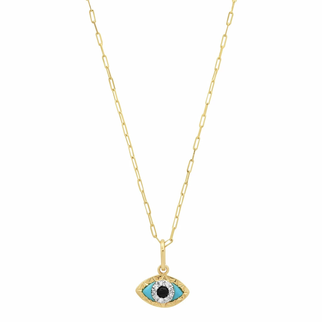 The evil eye is protection. Gold represents the 1st layer of protection. Turquoise represents the light by bringing in healing and alignment. Next a layer of diamonds to ailing you with your inner spirit and finally onyx as the eye the ultimate protection stone of all.