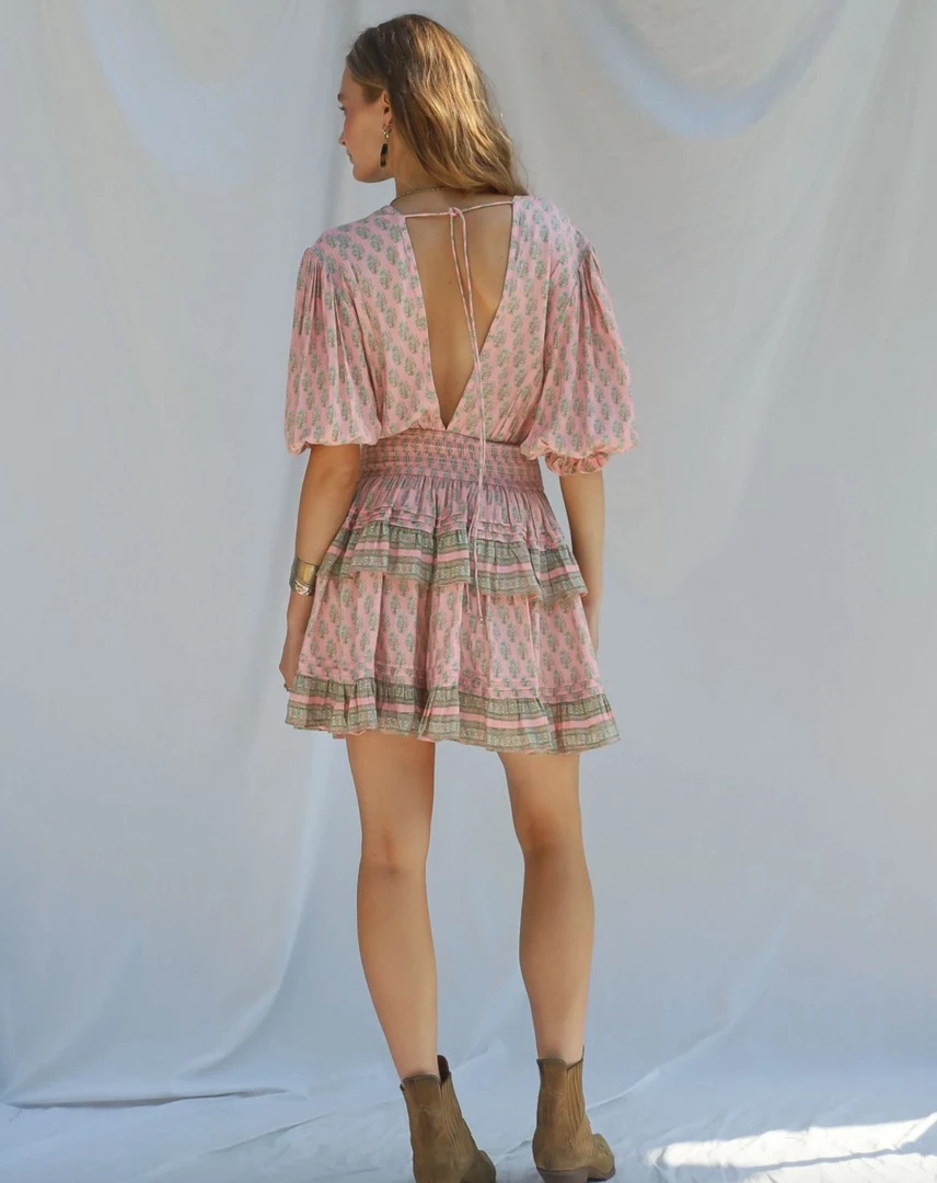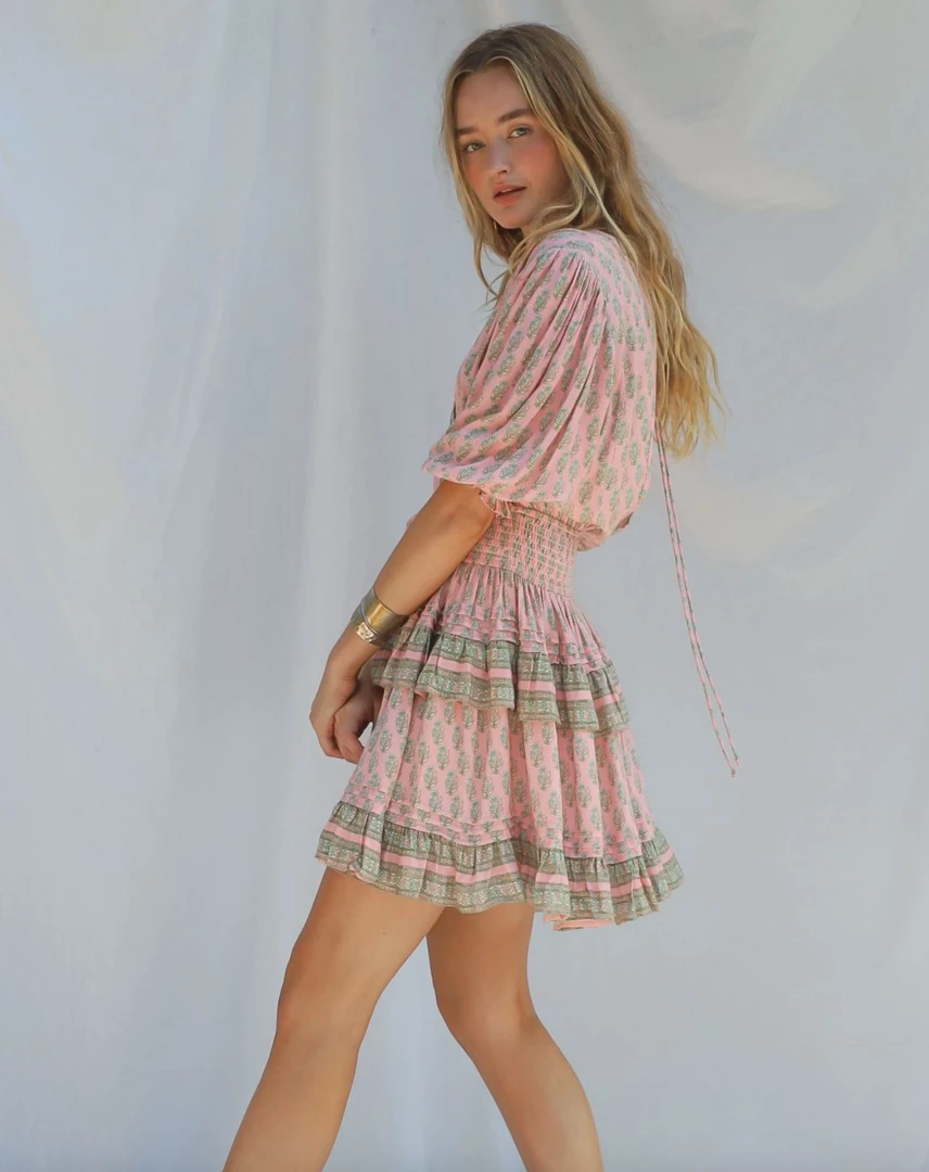 The Petit Mini Dress form Jen’s Pirate Booty is perfect for warmer days ahead! The Daydream Nectar print has a beautiful soft pink background with mossy green detailing. The ruffled skirt with the cinched waist and puffed sleeves makes for a feminine silhouette.