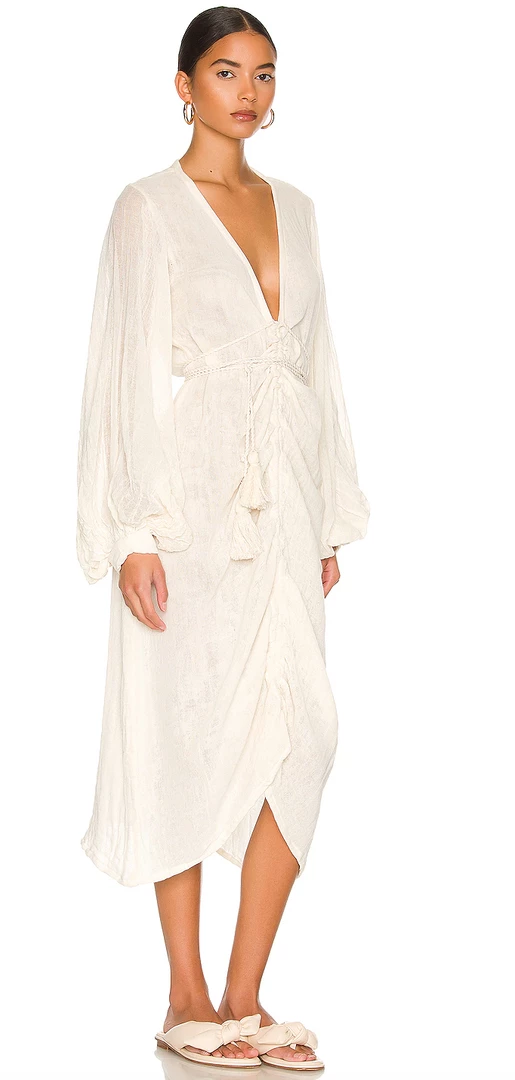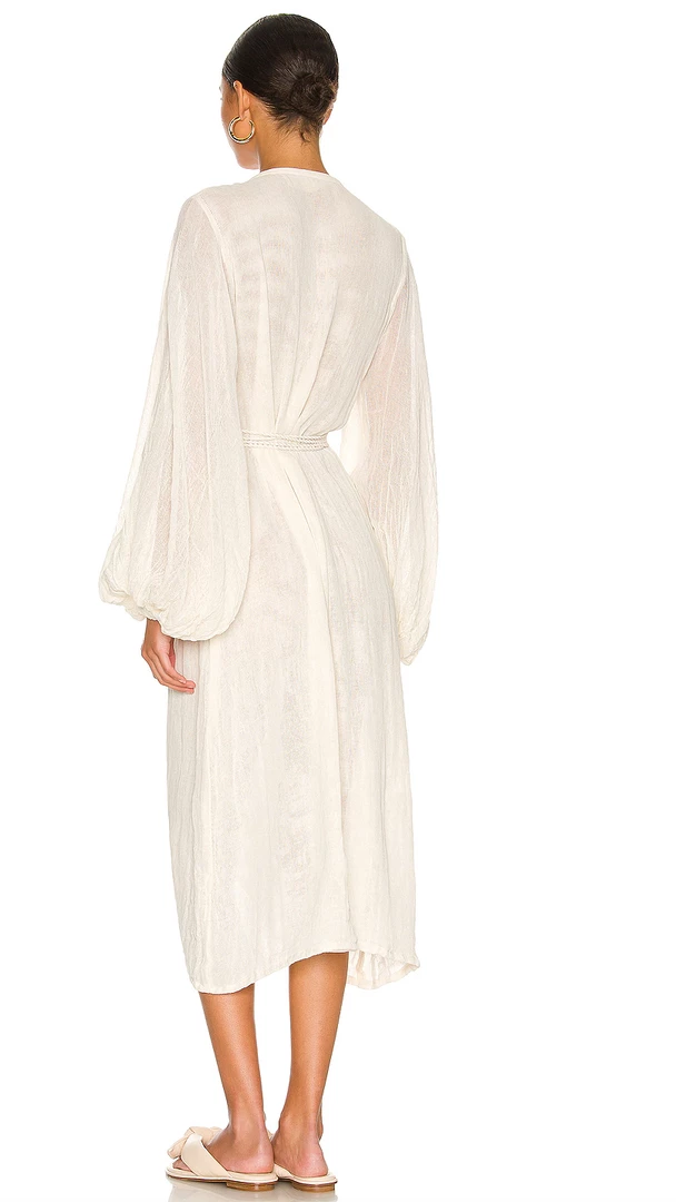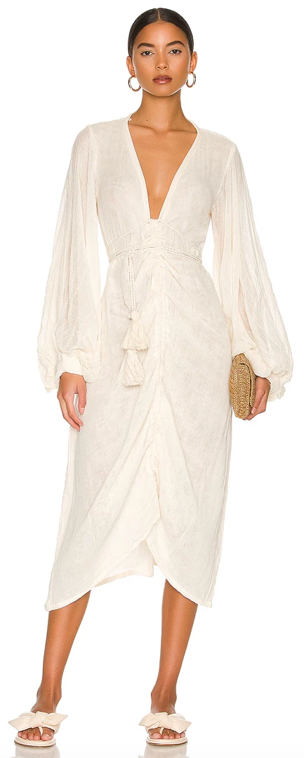 This tunic has a relaxed fit with ruching down the middle and billowing sleeves that gather at the wrist. The front tie can be worn tied behind the neck for an added neckline detail or cinched to shorten the length.
