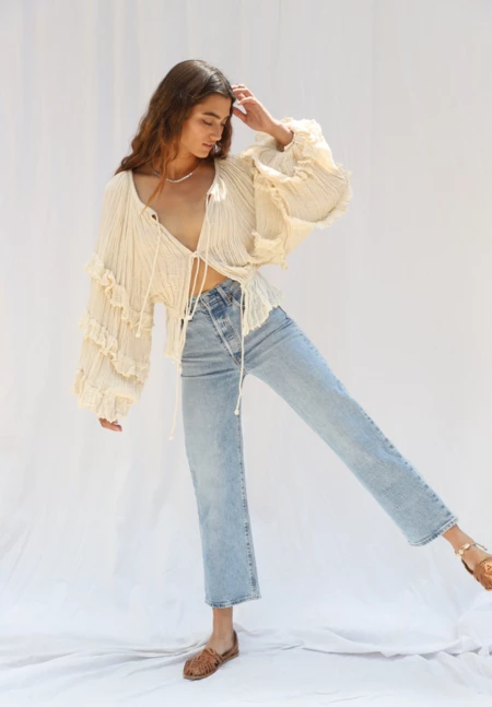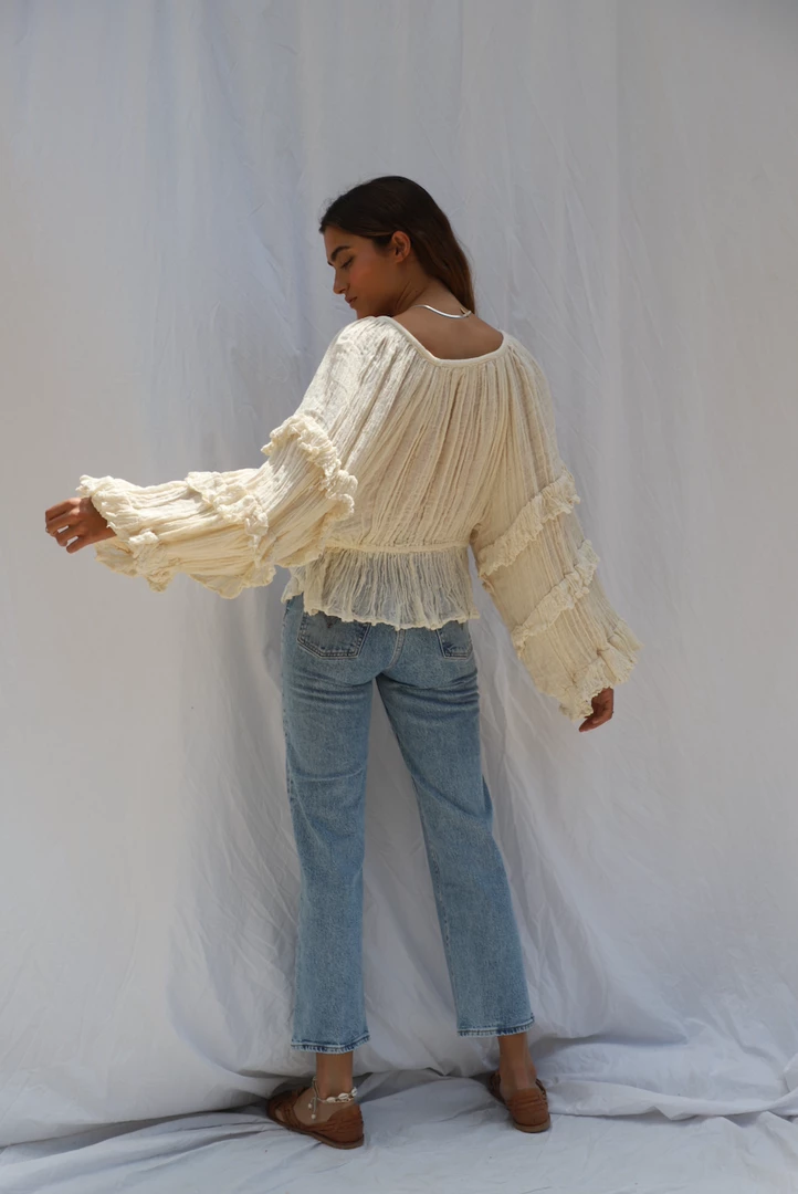This Piece is a cute novelty option from Jens for Holiday featuring a tiered ruffle through the body area and bell sleeve. Button down and can be worn as a top individually or as a duster over tunic options. 100% Cotton Gauze Fun and flirty made by hand with cotton gauze in Mexico. Oversized for all body types.