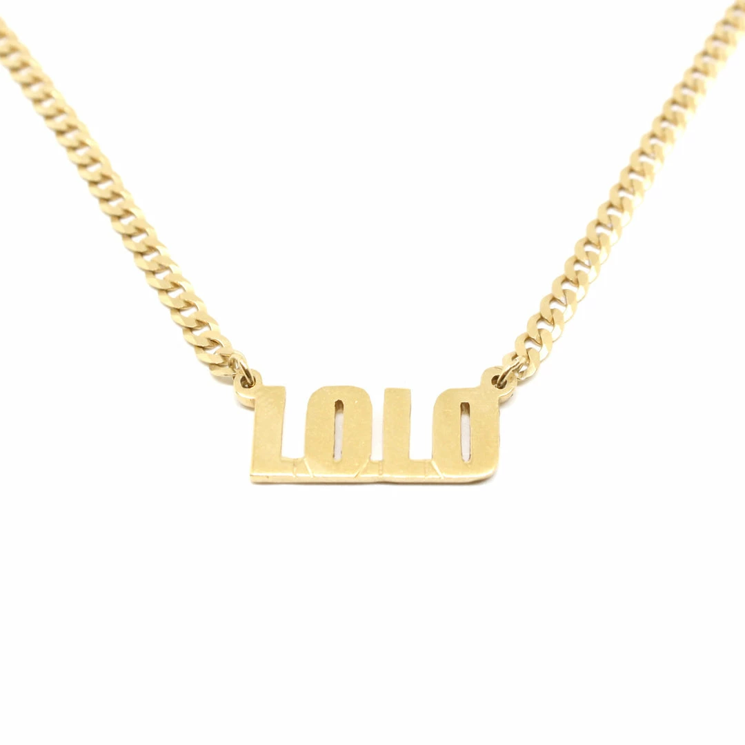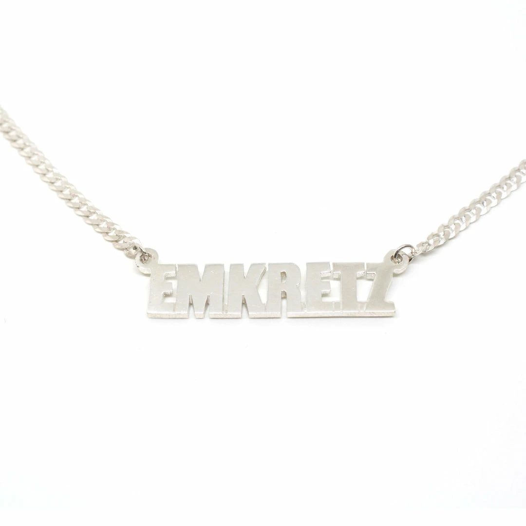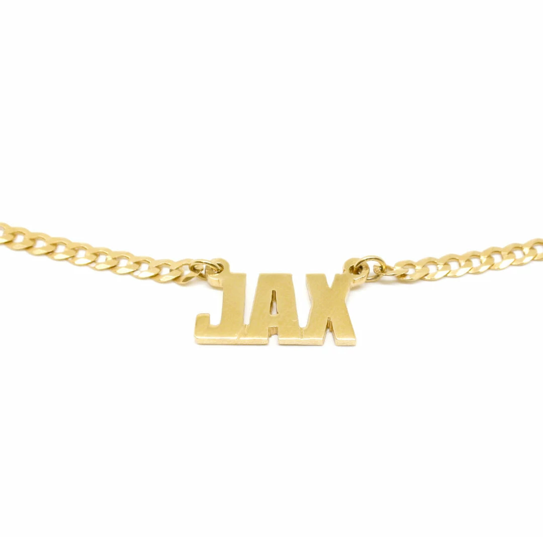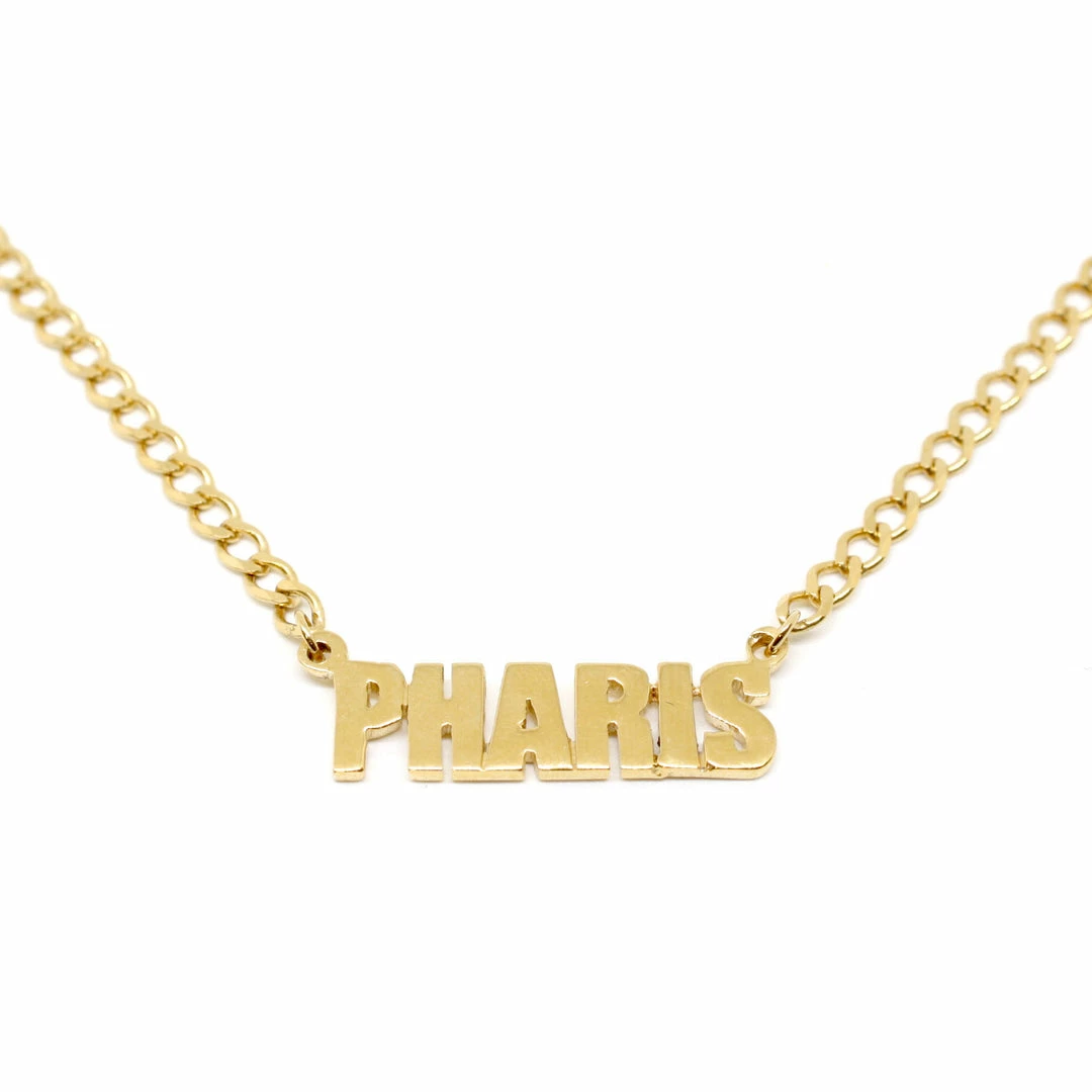 Mini nameplate necklace. Customize your own name. Classic block font. As seen on Madison Beer and Sofia Richie. A favorite of Kim, Kourtney, and Khloe Kardashian.