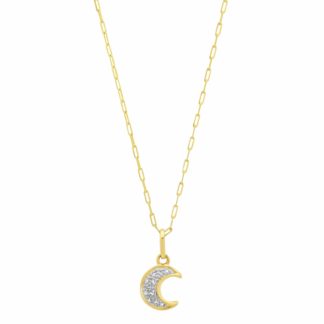 Diamond pave moon necklace. The crescant moon is a symbol or life, new beginings, and creation. It is a symblo of growth and thriving. Be a moon goddess. Bring forth new experiences and creation by wearing this neckalce and exude moon Goddess energy.