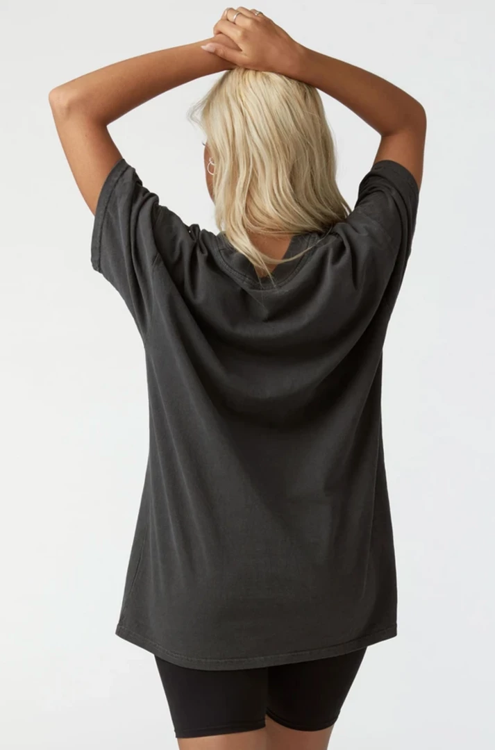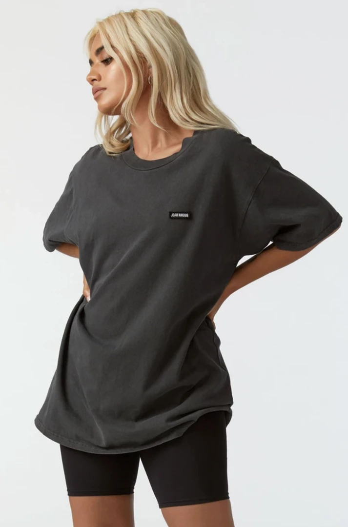 Classic and oversized crew neck tee featuring a sewn-on logo patch.