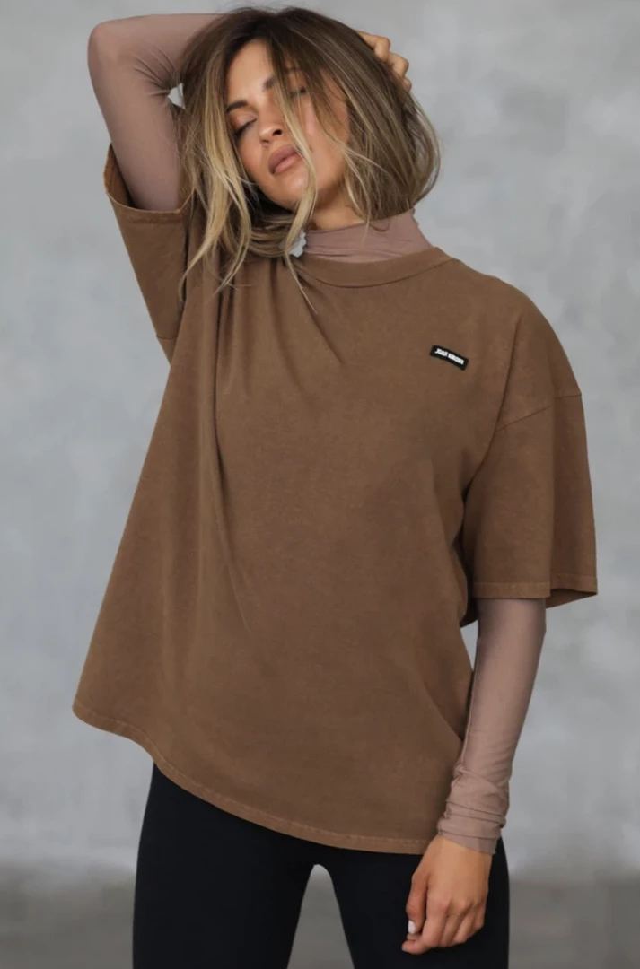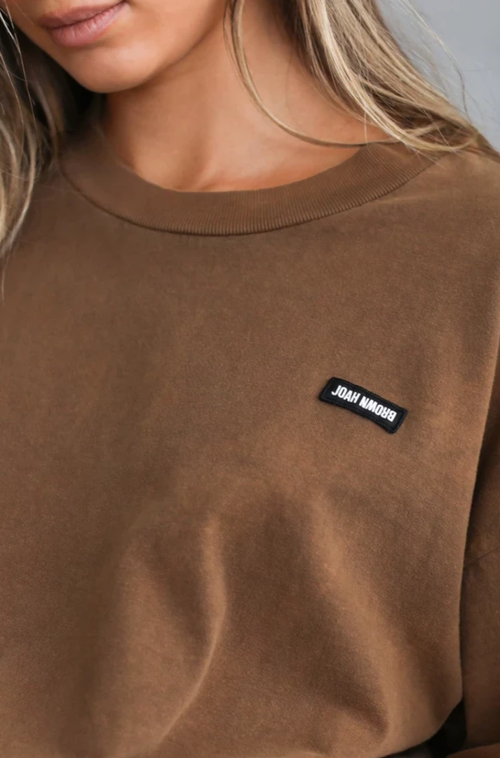 Classic and oversized crew neck tee featuring a sewn-on logo patch.