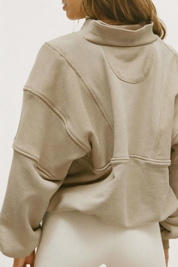 VINTAGE INSPIRED ZIP PULLOVER WITH RIBBED ACCENTS AND HIDDEN KANGAROO POCKET. OVERSIZED FIT.