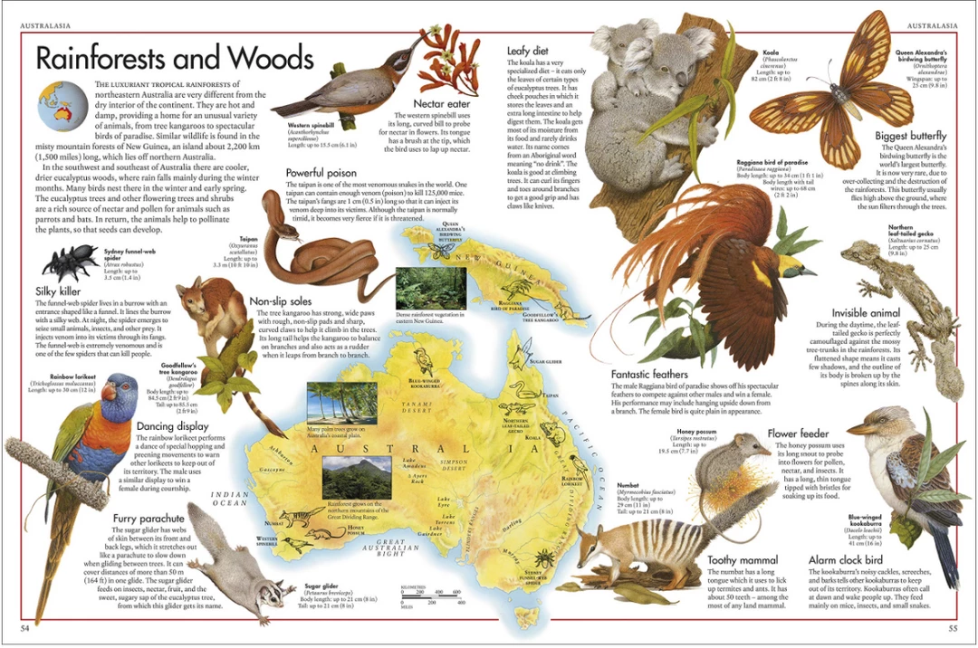 This lavishly illustrated nature book explores the different continents and countries of the world, with helpful information on geography, climate, and vegetation. It travels through different biomes, such as forests, deserts, and lakes; and through specific regions, from the Everglades to the Galapagos, the Himalayas, and Great Barrier Reef.