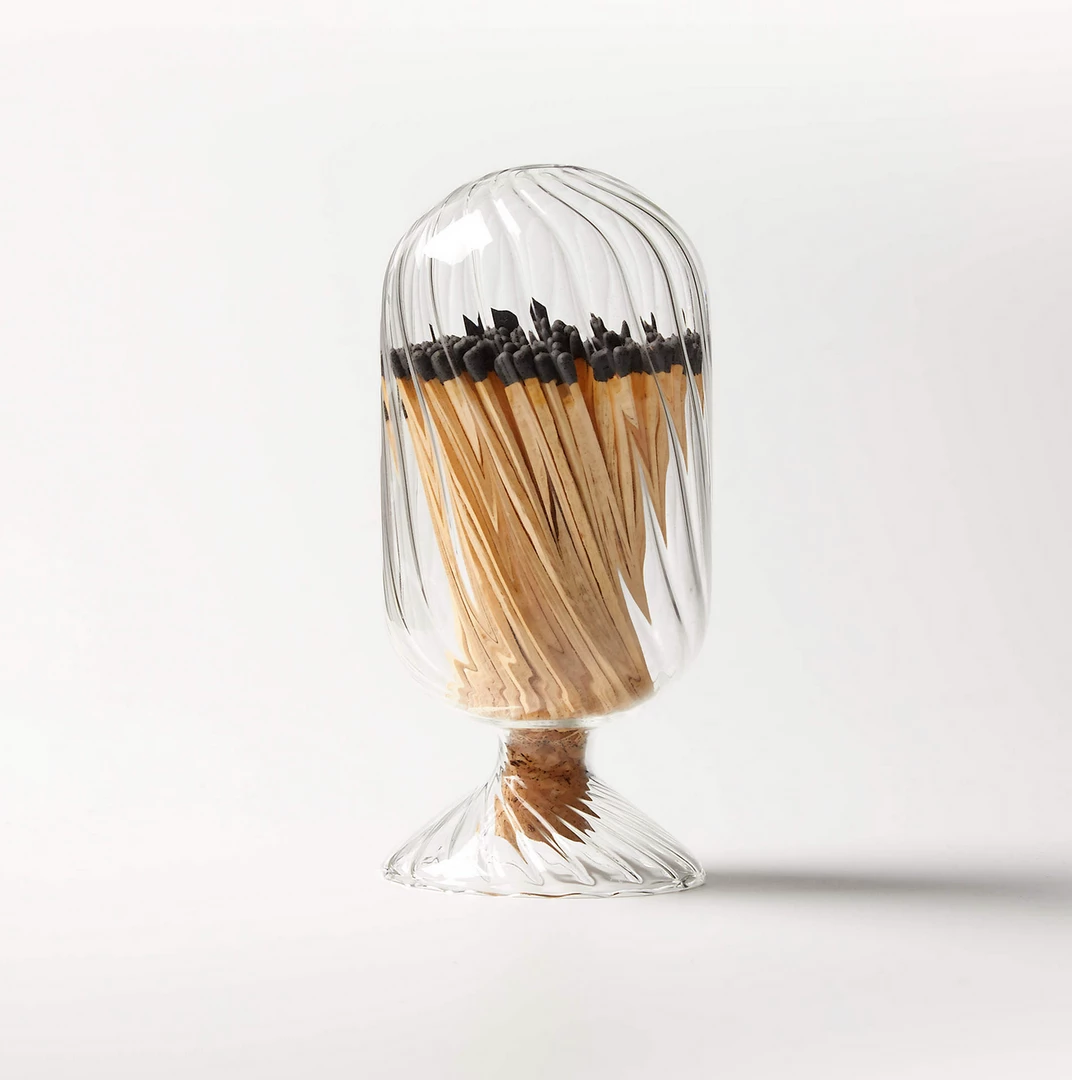 The word helix, Greek for twisted, perfectly describes the ribbed inside of our new, clear match cloche collection. The spiral texture adds interest and updates our newest style of match cloche. Available in three match-tip colors, black, white and red, they are equally at home in a modern-industrial space as in a home with more traditional decor. Crafted from hand-blown glass with 120 four-inch matches and a strike-on-bottle flint.
