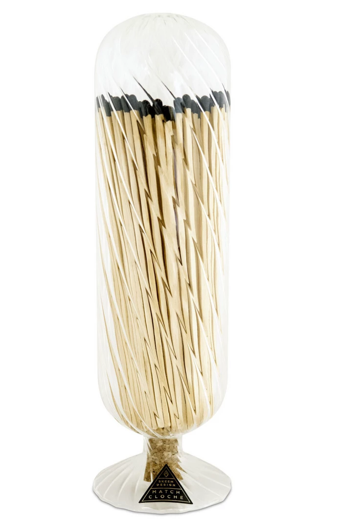 The word helix, Greek for twisted, perfectly describes the ribbed inside of our new, clear match cloche collection. The spiral texture adds interest and updates our newest style of match cloche. Crafted from hand-blown glass with 120 eight-inch matches and a strike-on-bottle flint.